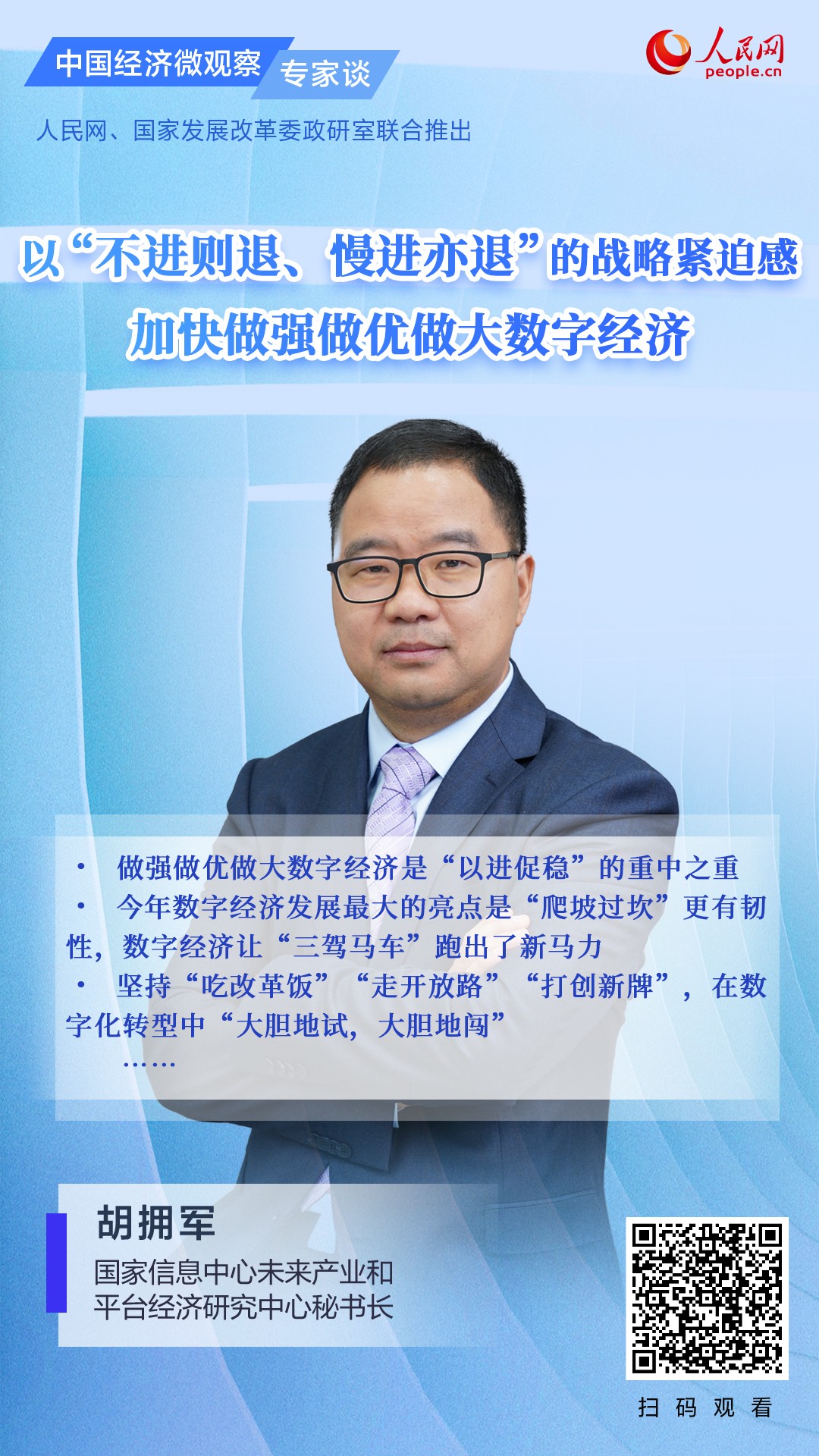 近日,国家信息中心未来产业和平台经济研究中心秘书长胡拥军做客《中国经济微观察·专家谈》栏目时表示,“以进促稳”是中央经济工作会议释放的最鲜明的积极信号之一,从经济回升向好的趋势、潜力、基础来看,做强做优做大数字经济是“以进促稳”的重中之重。